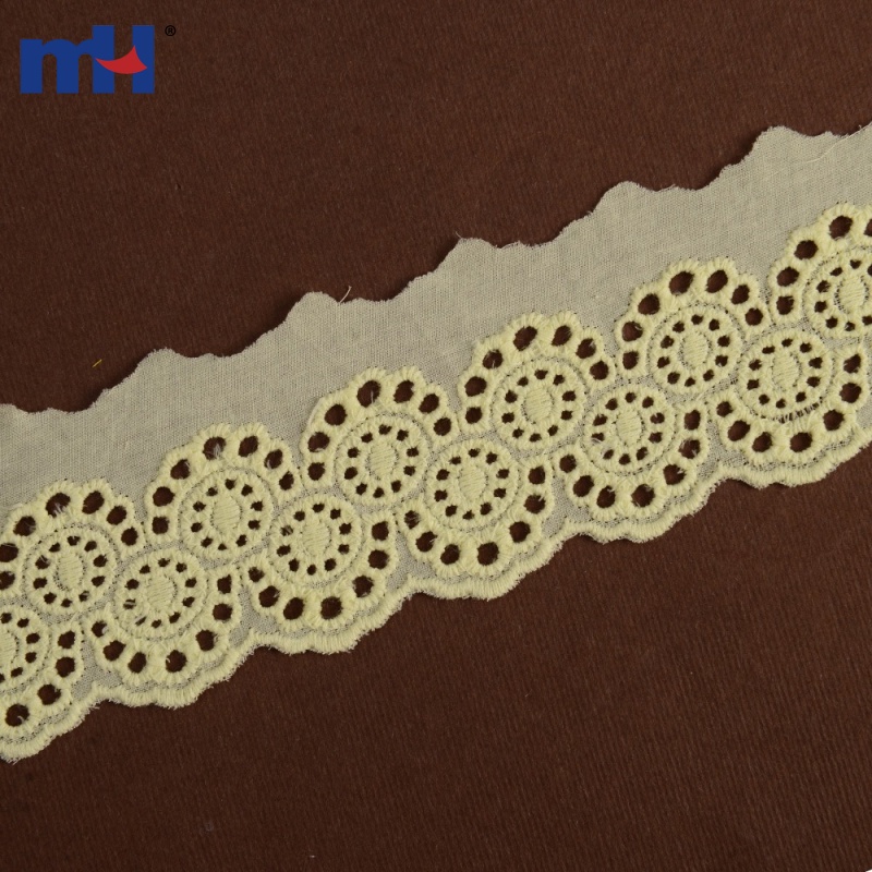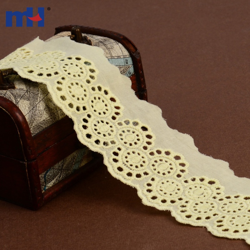100% Cotton lace Trimming Size: 5.0cm Cotton lace in 100% cotton All kinds of size available upon enquiry. Available in various designs and colors as per buyers requirement.