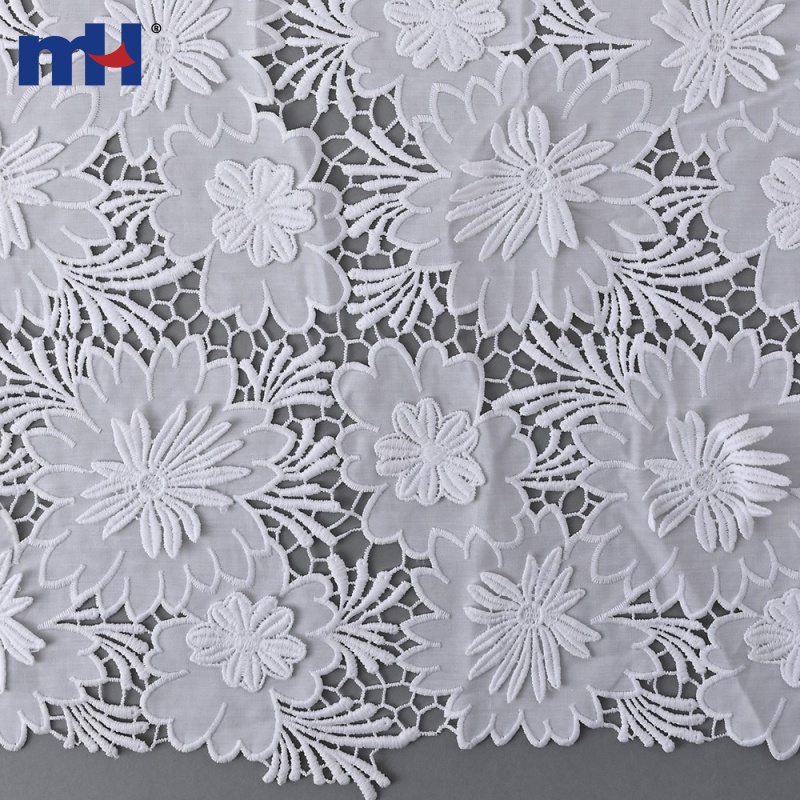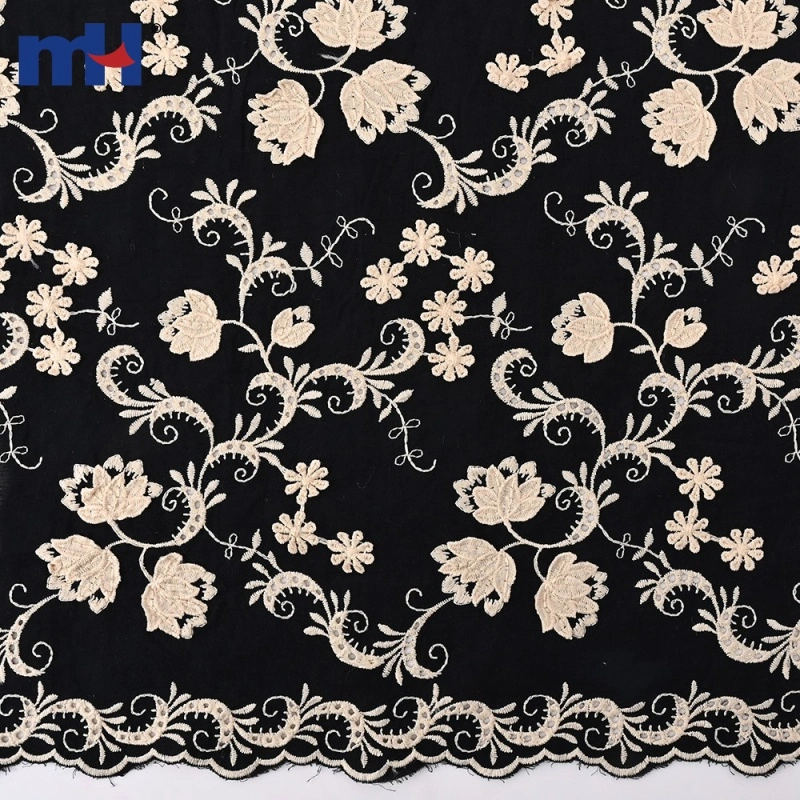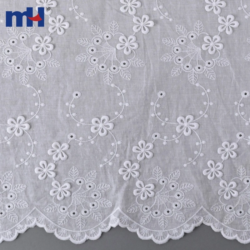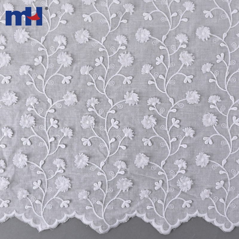 MH 3D Cotton Lace Fabric Collection features raised floral embroidery and scalloped edges on a 100% cotton base. Soft, breathable, and skin-friendly, these styles are perfect for premium garments and décor. We support OEM/ODM customization and reliable wholesale supply.