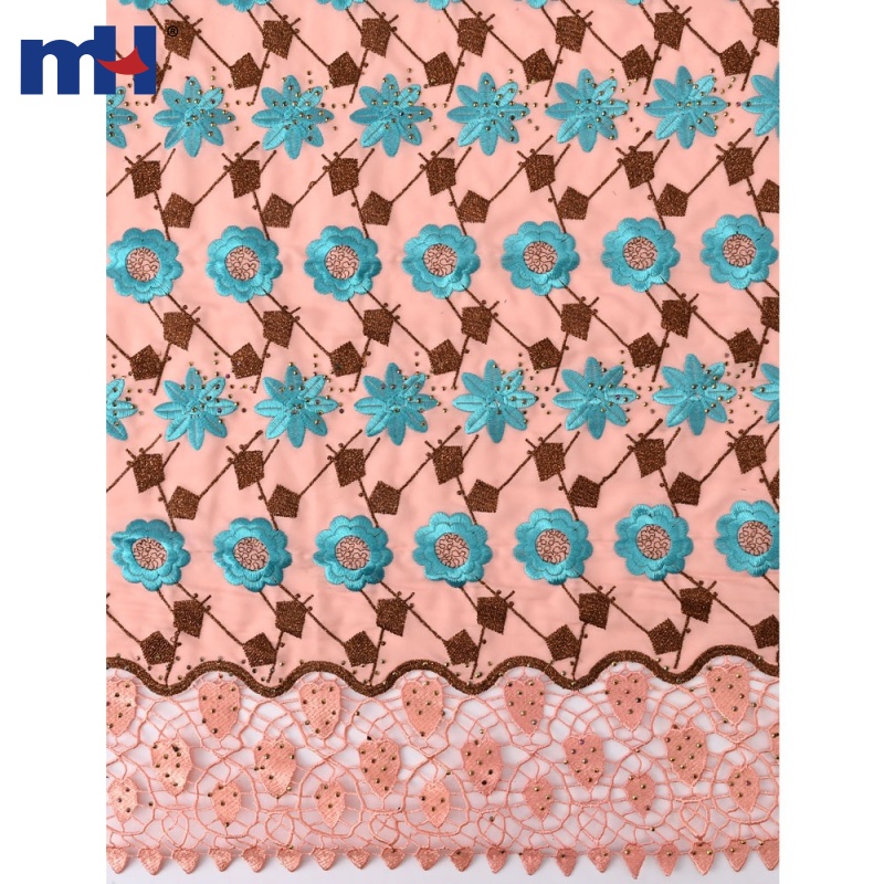 A premium 100% polyester cotton-look lace fabric in soft peach, 132 cm wide. Features alternating rows of turquoise floral embroidery and brown geometric diamond motifs, accented with gold hot-fix rhinestones and finished with a delicate scalloped lace border. Wholesale only (MOQ 500 yards per design), offering a smooth hand feel and long-lasting performance.