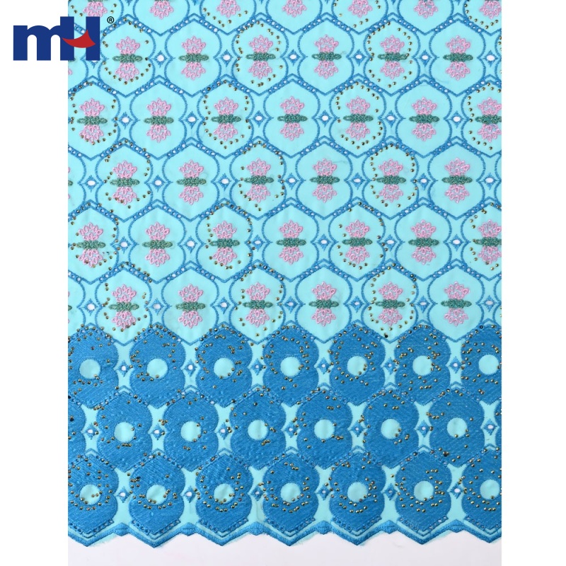 A vibrant aqua-toned 100% polyester “cotton-look” lace fabric, 132 cm wide. Top panel features geometric cutwork hexagons filled with tiny pink floral embroidery, transitioning to a bold circular-motif border. Gold hot-fix rhinestones sprinkled across the design add subtle sparkle. Wholesale only (MOQ 500 yards per design), combining soft hand feel, durability, and eye-catching texture.