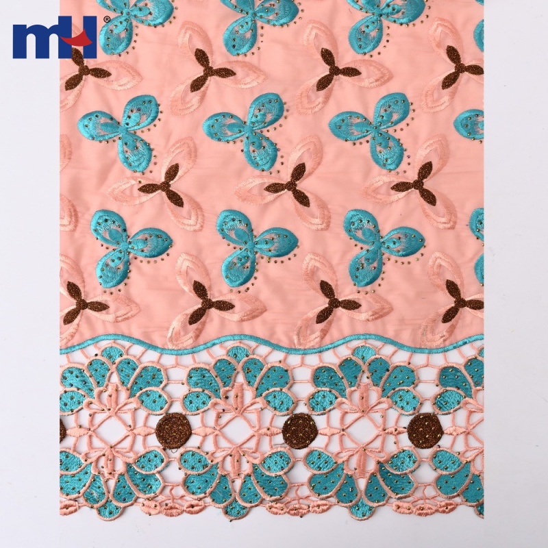 A premium 100% polyester cotton-look lace fabric in soft lavender-pink, 132 cm wide. Showcases sweeping abstract floral and leaf motifs in deep purple and blush-pink, each accented with gold hot-fix rhinestones for a refined sparkle. Wholesale only (MOQ 500 yards per design), offering a gentle hand feel, lasting performance, and standout texture.