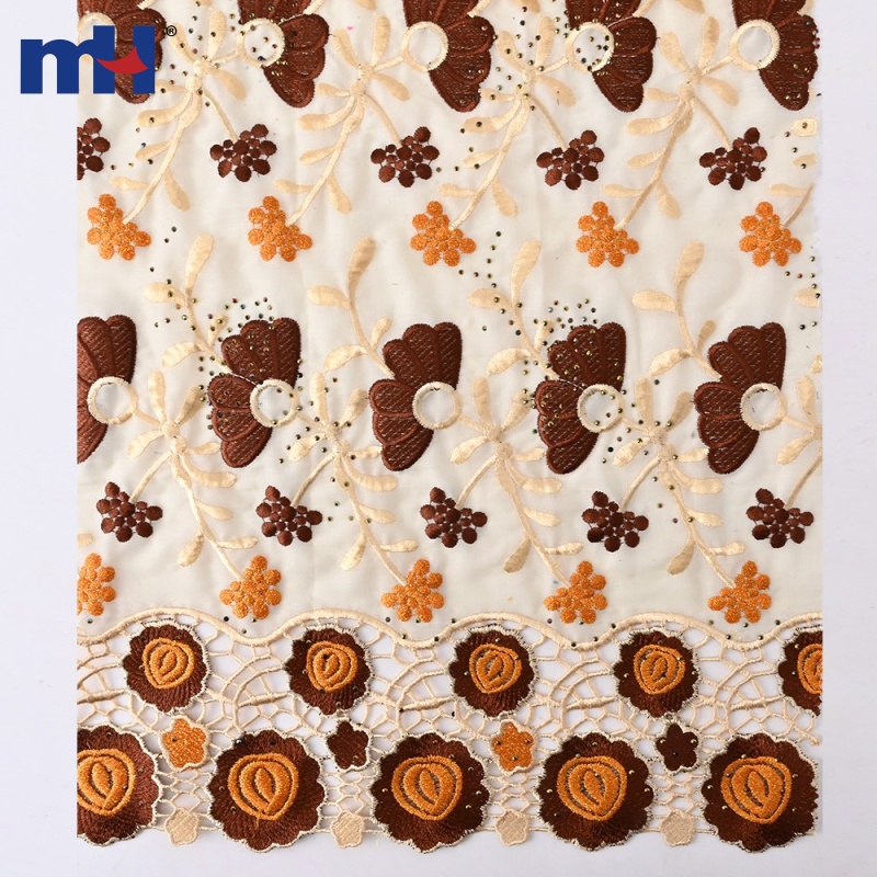 A premium 100% polyester cotton-look lace fabric in soft peach, 132 cm wide. Features alternating rows of turquoise floral embroidery and brown geometric diamond motifs, accented with gold hot-fix rhinestones and finished with a delicate scalloped lace border. Wholesale only (MOQ 500 yards per design), offering a smooth hand feel and long-lasting performance.