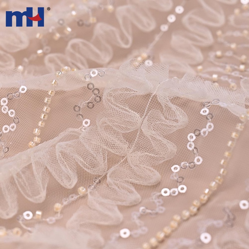 The raised tulle elements form consistent pleated effects across the fabric surface, while the beads and sequins add subtle sparkle, enhancing the overall luxury appearance without overwhelming the design. This fabric offers a light, airy look with rich detailing, making it highly suitable for high-end eveningwear and bridal applications.