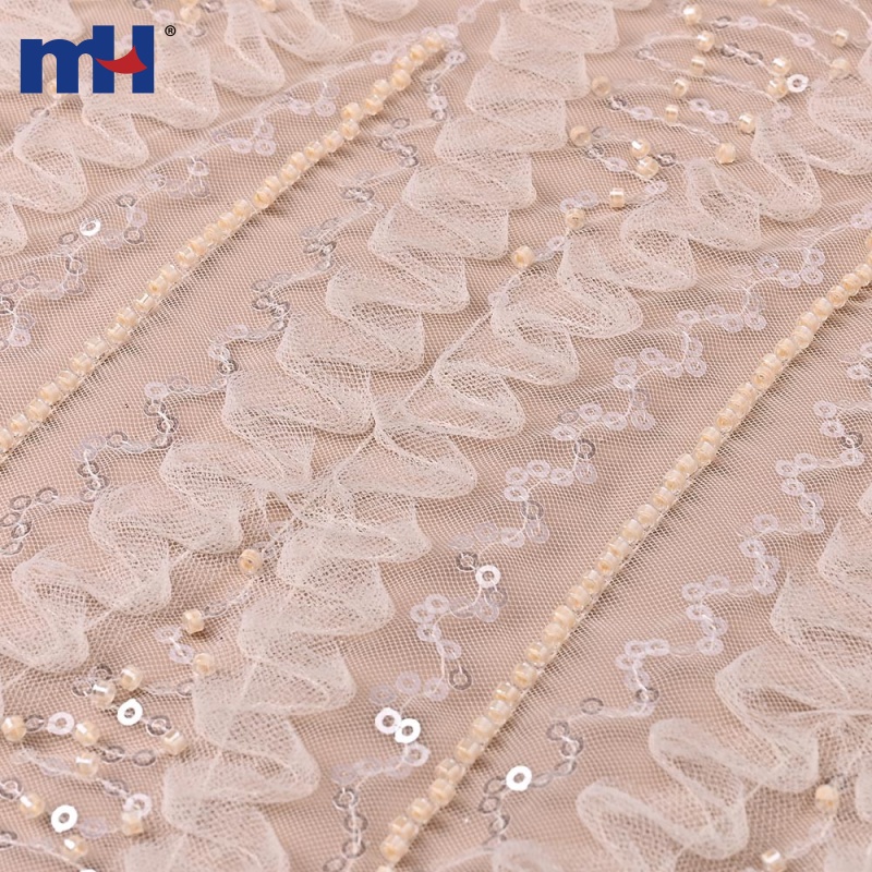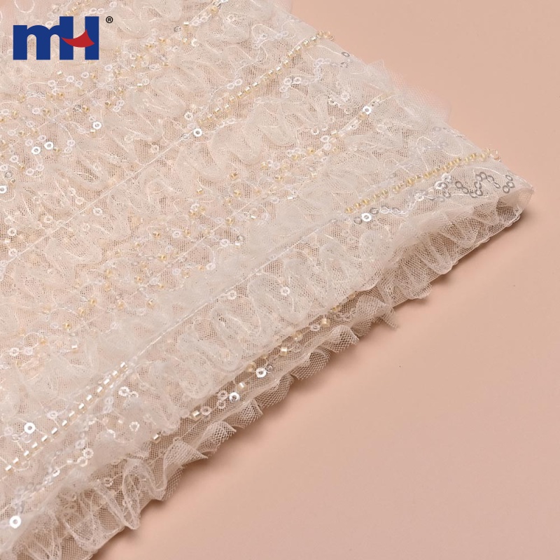 This beaded and sequin embroidered allover fabric is delicately crafted on a fine mesh base, featuring vertically arranged decorative lines composed of hand-applied beads, sequins, and layered tulle ruffles. The unique combination of soft mesh folds and shimmering embellishments creates a refined three-dimensional texture with elegant movement and depth.
