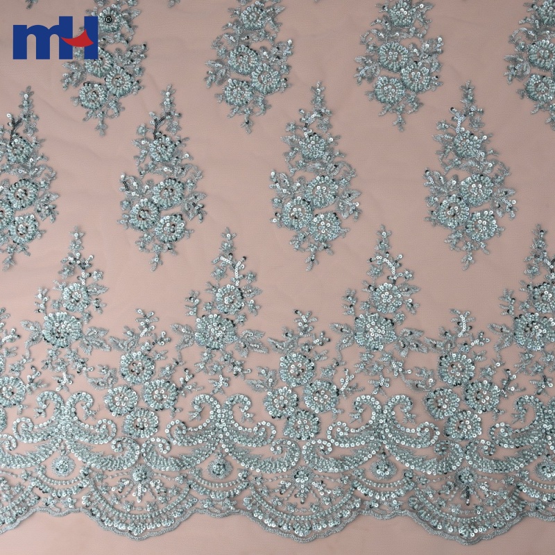 Luxurious lace fabric featuring intricate floral & scroll motifs embroidered with shimmering sequins and delicate glass beads on a soft mesh base. The three-dimensional sparkle, elegant texture, and scalloped edge make it perfect for bridal gowns, evening dresses, overlays, and couture details.
