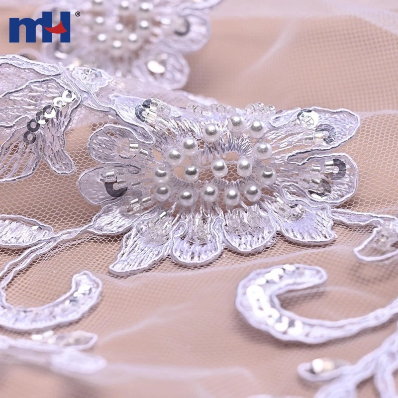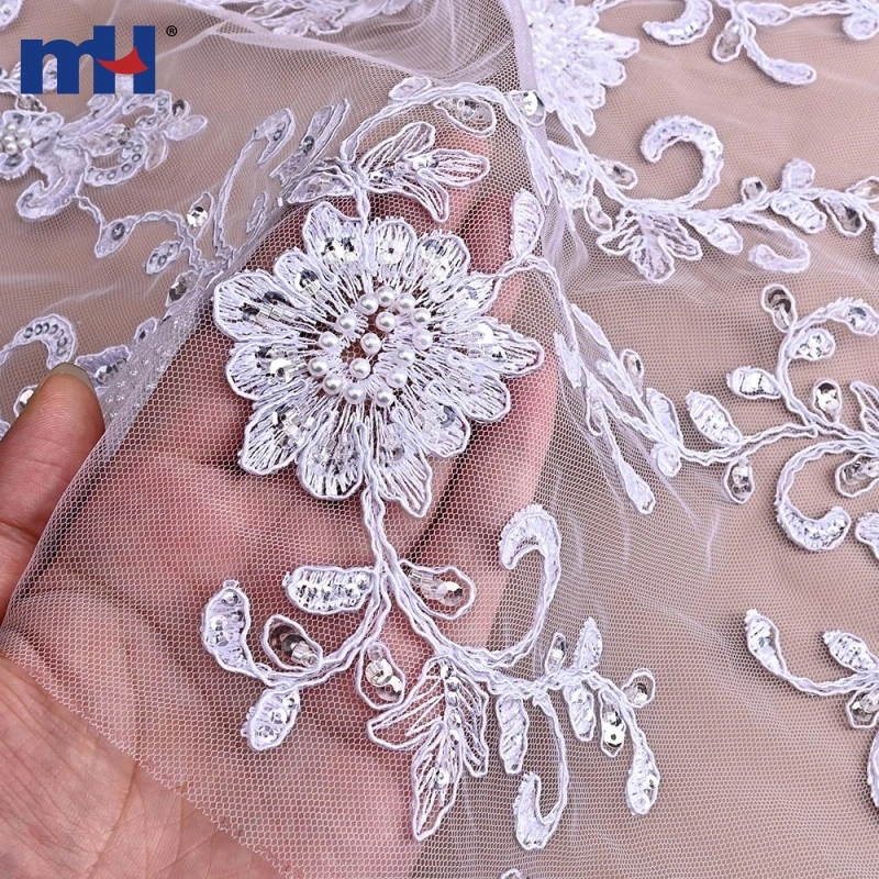 The raised corded embroidery defines the floral patterns clearly, while the sequins and beads add subtle sparkle and depth, making the fabric visually striking yet sophisticated—ideal for premium bridal and formalwear applications.
