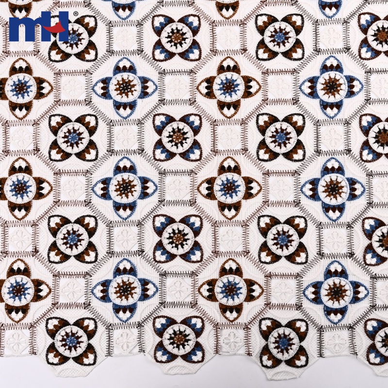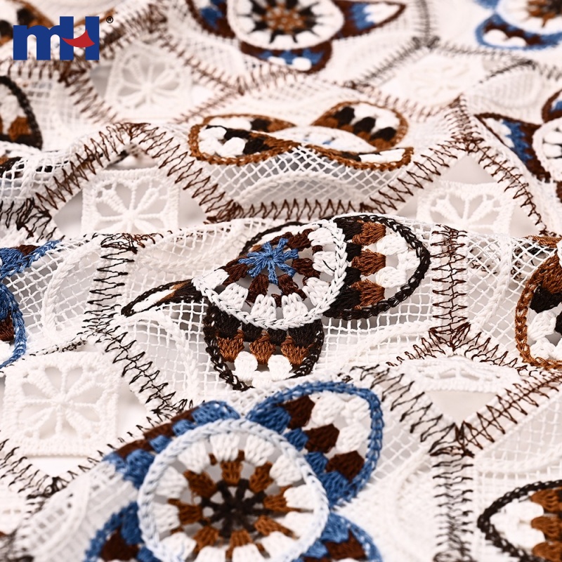 This colorful cotton guipure lace fabric features a unique geometric floral design made with multi-tone cotton embroidery threads on a water-soluble base.