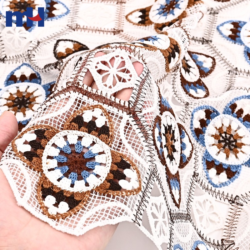 The lace has a handcrafted crochet appearance, excellent texture, and soft yet structured drape, making it perfect for fashion dresses, skirts, blouses, and home decorations.