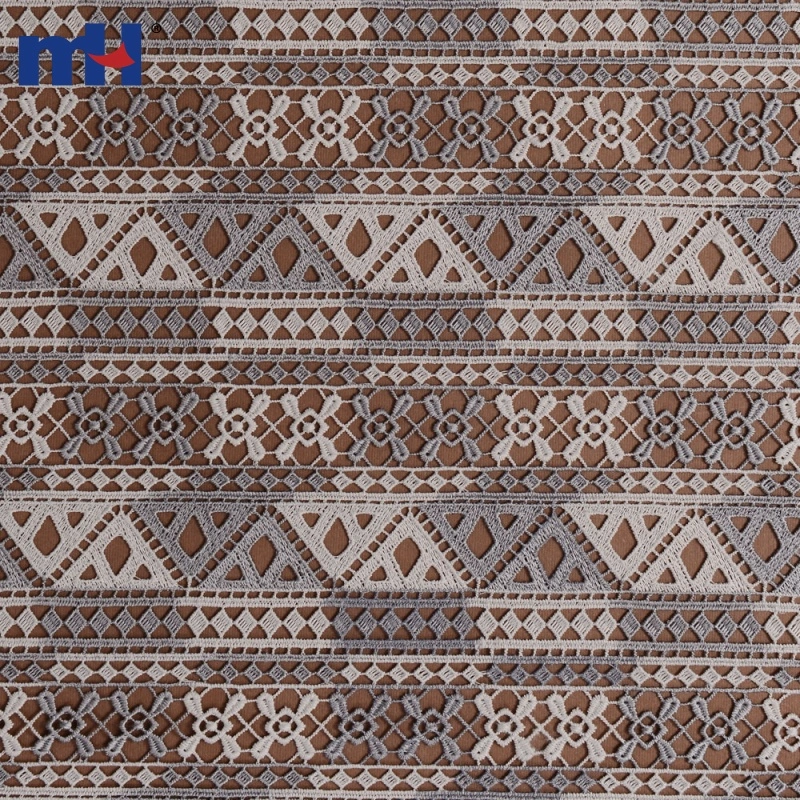 This premium lace fabric is made with 150D/3 polyester bright thread on 48G water-soluble paper, featuring an intricate floral cutwork design. The embroidery is dense, refined, and full of dimension — after the water-soluble base is removed, it leaves a soft, delicate hollow floral lace with excellent texture and sheen.
