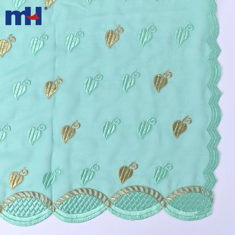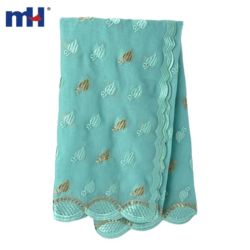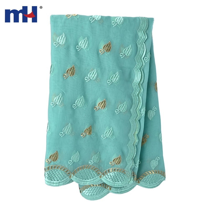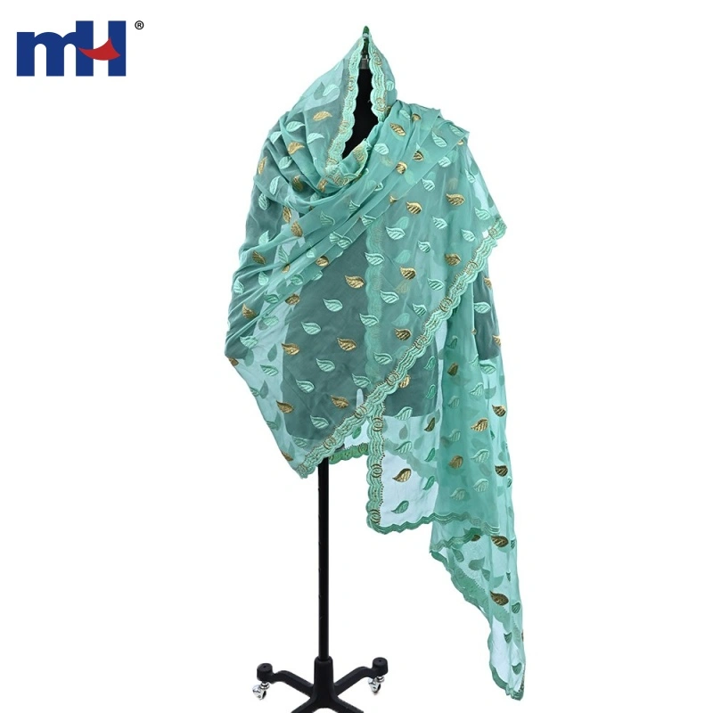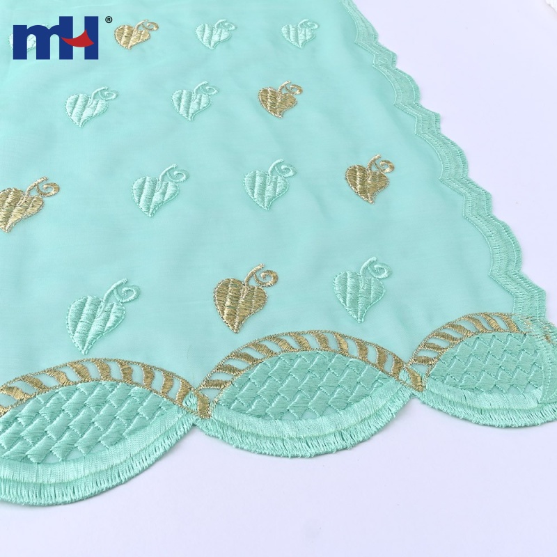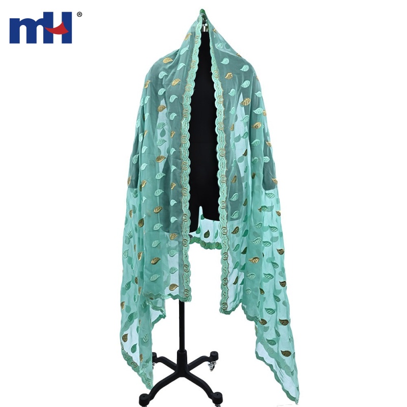 Design: This scarf showcases an elegant leaf embroidery pattern in pastel turquoise and metallic gold, creating a sophisticated yet playful aesthetic. The scalloped edges feature intricate geometric stitching, enhancing its overall appeal.