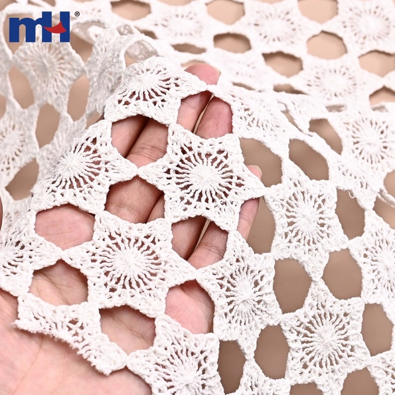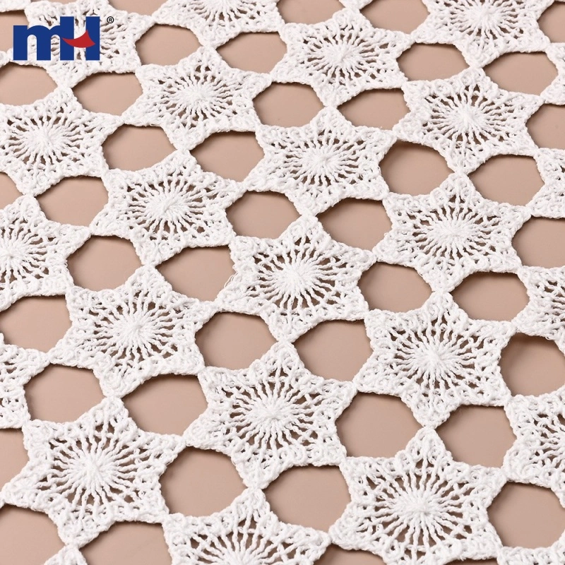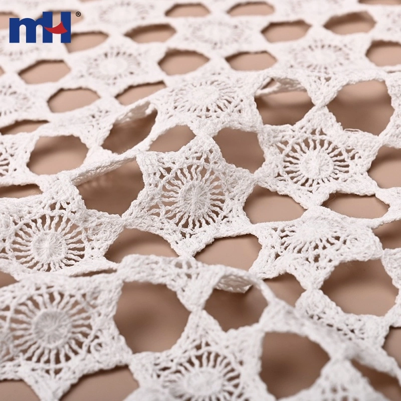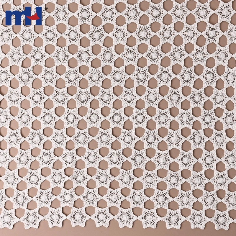 This Corded Guipure Lace Fabric features a beautiful star-shaped geometric pattern made with fine cotton cord embroidery on a 48G water-soluble base. The intricate openwork design and three-dimensional corded texture create a delicate, handcrafted aesthetic.