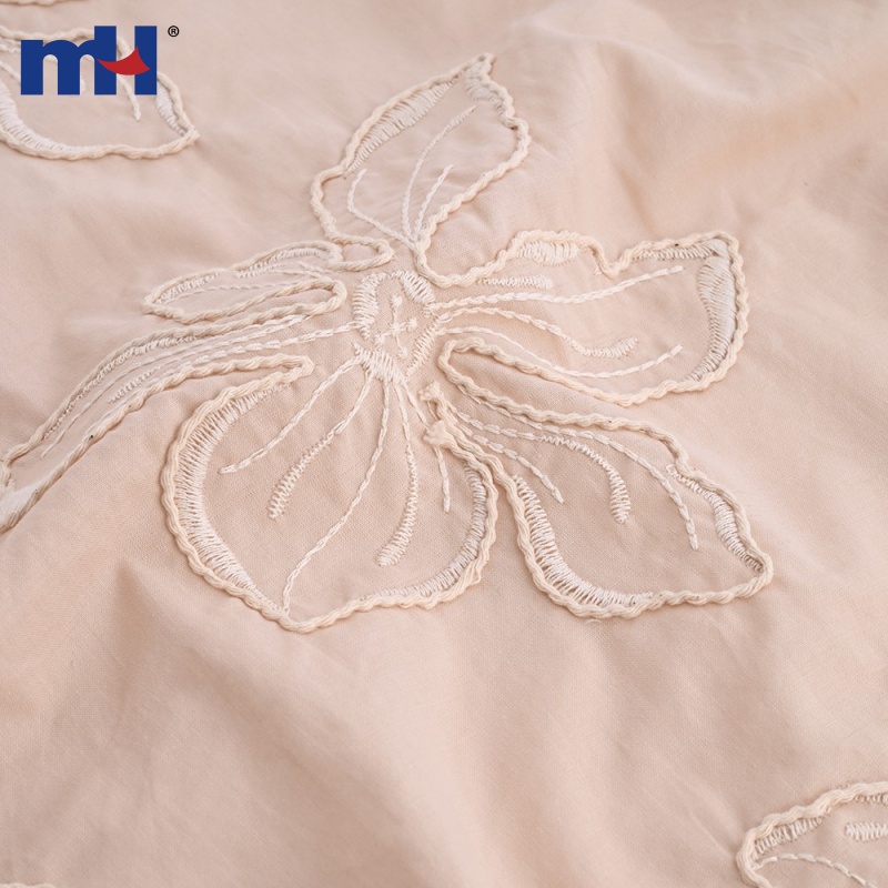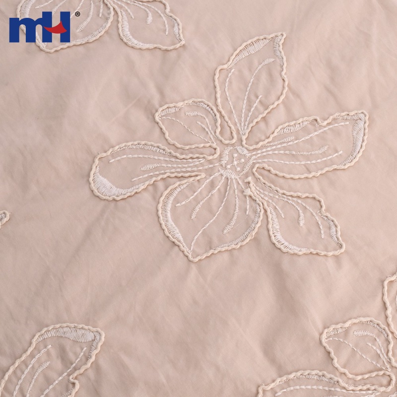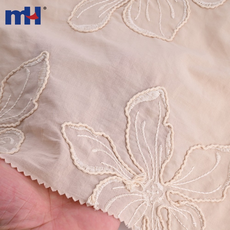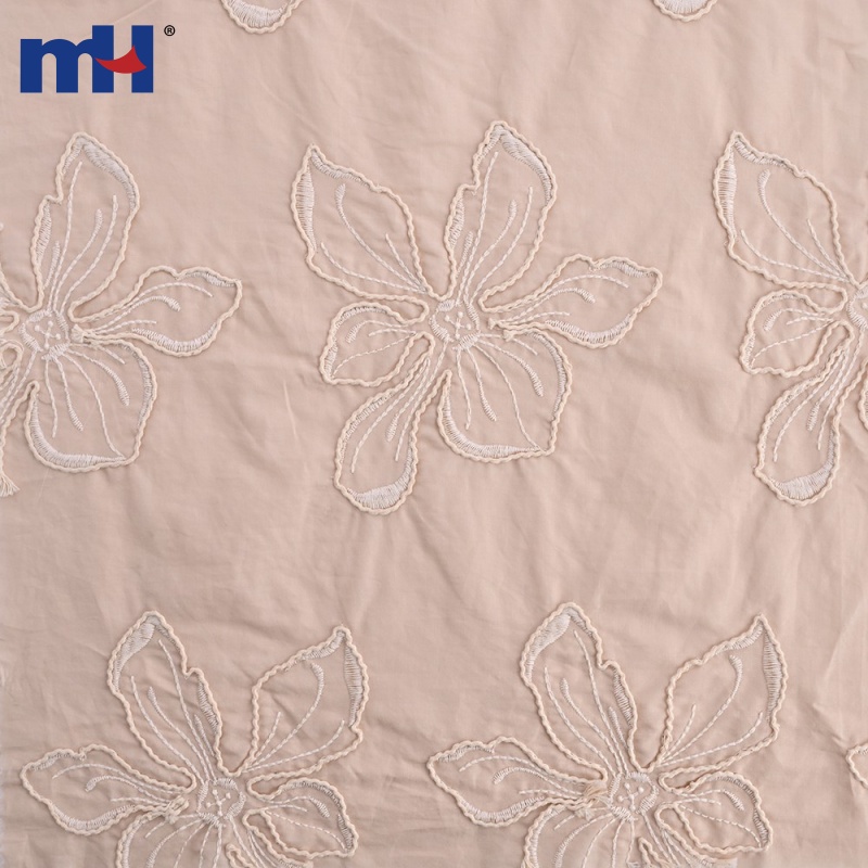 This exquisite embroidery fabric features large corded floral motifs stitched on soft, breathable cotton. The design uses 30S/2 cotton thread combined with 12-ply 10S cord thread, creating a bold and raised embroidery texture. Each petal and leaf is carefully outlined with cords, giving the flowers a sculpted, three-dimensional look.