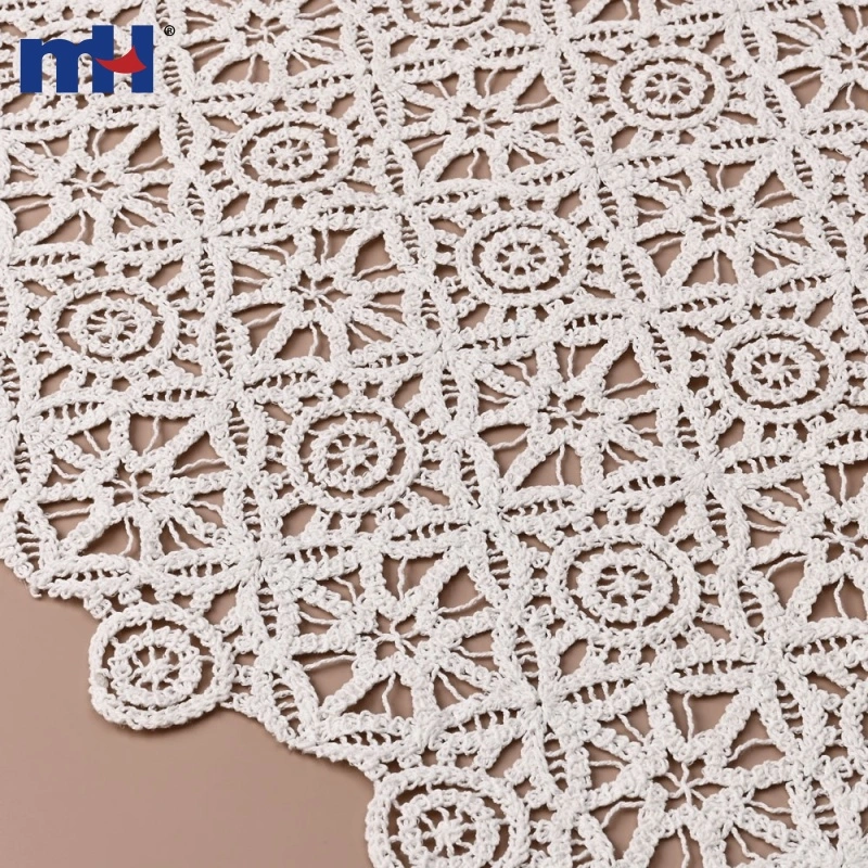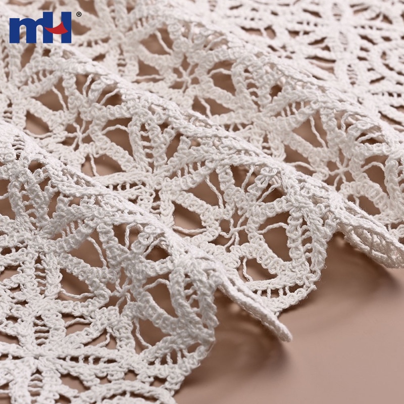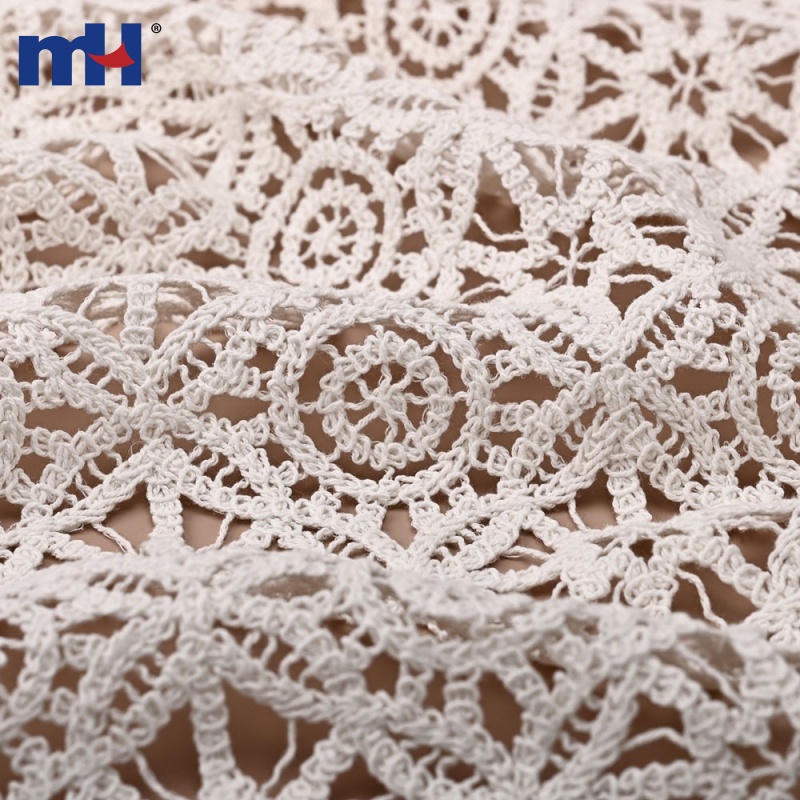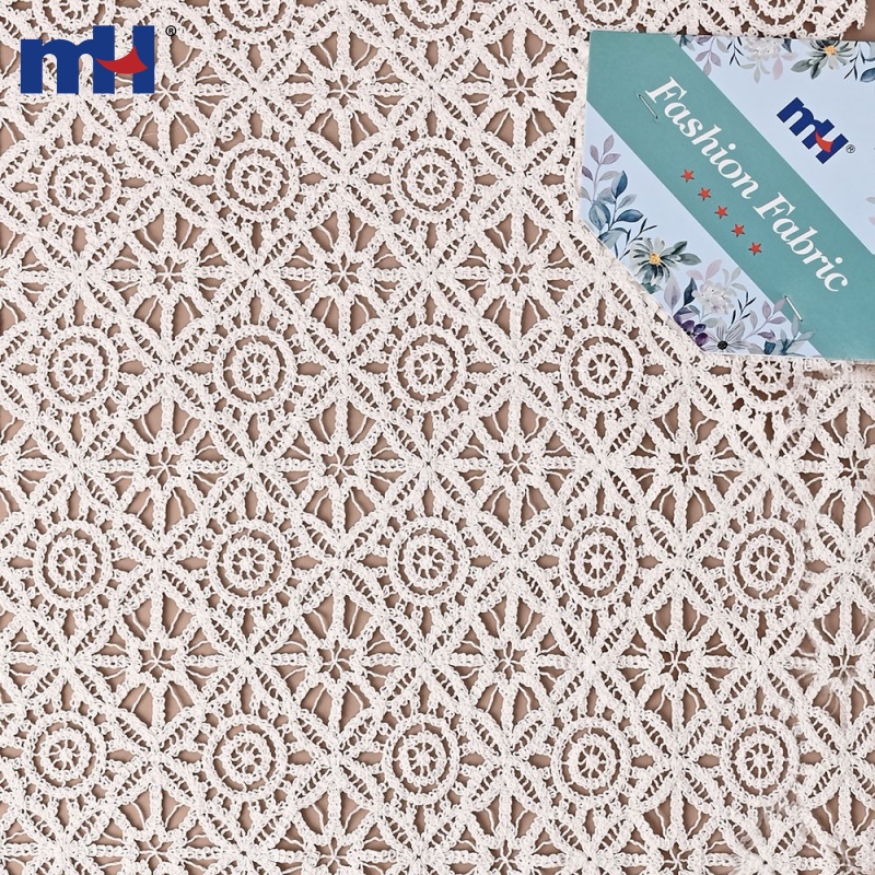 The heavy cotton cord threads give the lace a handcrafted crochet-like look, while maintaining a soft yet firm drape. Ideal for creating elegant dresses, tops, skirts, and vintage-style apparel, this fabric combines traditional craftsmanship with modern sophistication.