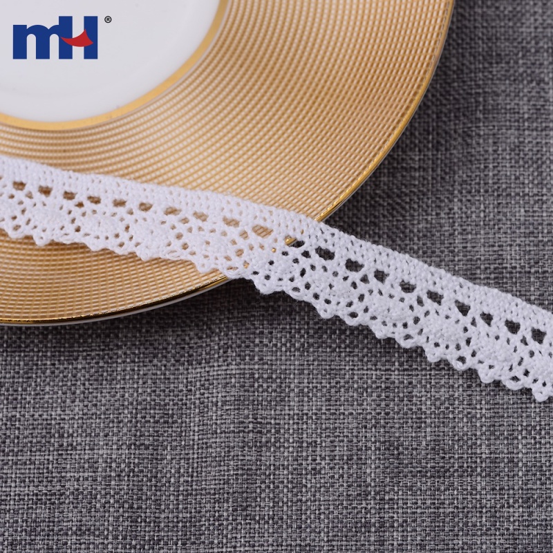 Width: 1.5cmMaterial: 100% CottonPacking: 25yds/pcMOQ: 5000ydsThis lace is ideal for underwear, fashion garments, evening dress, wedding dress.etc