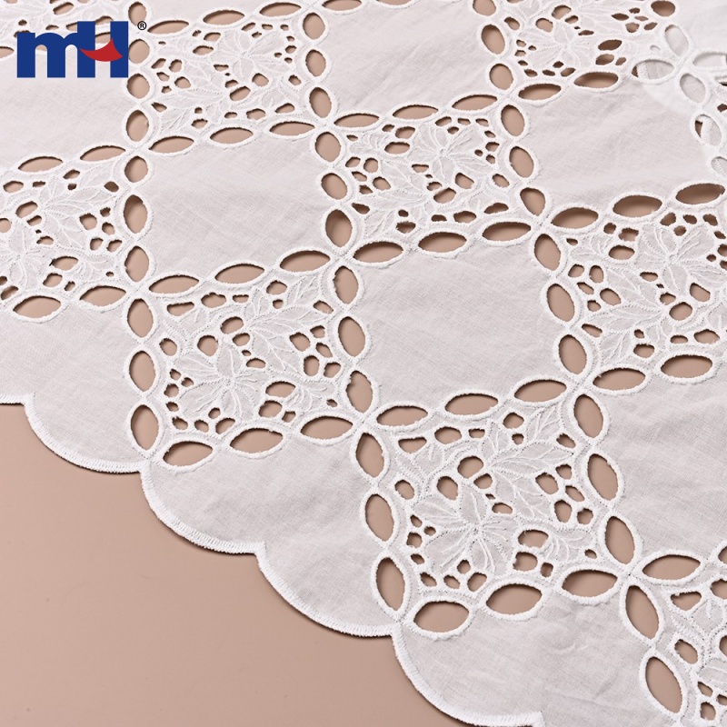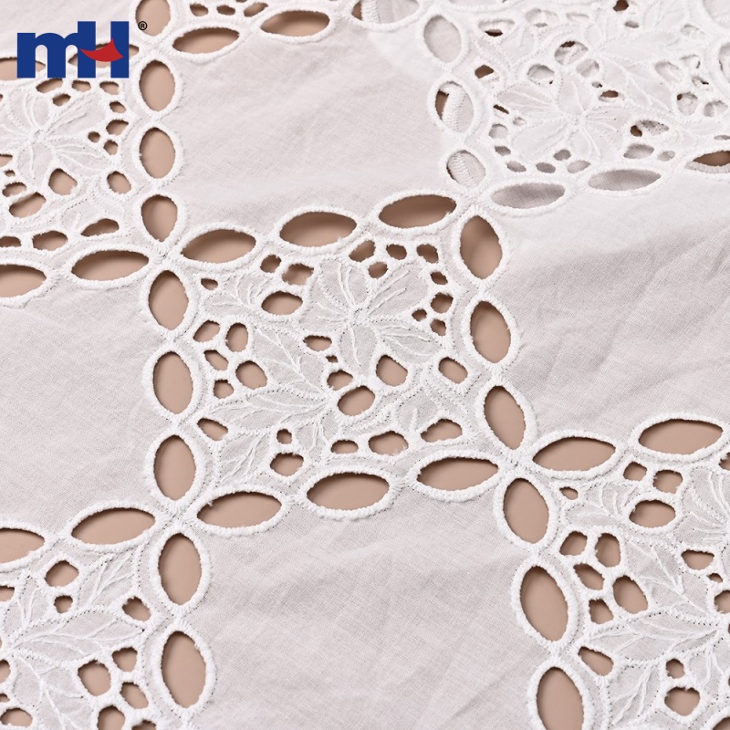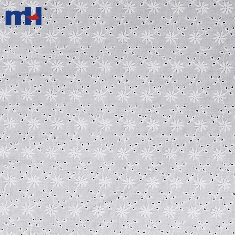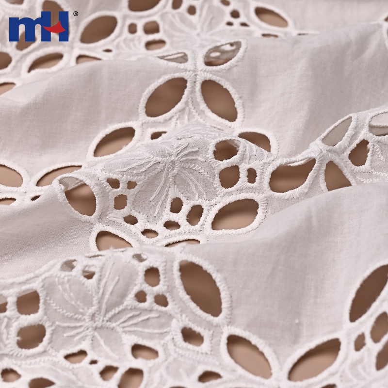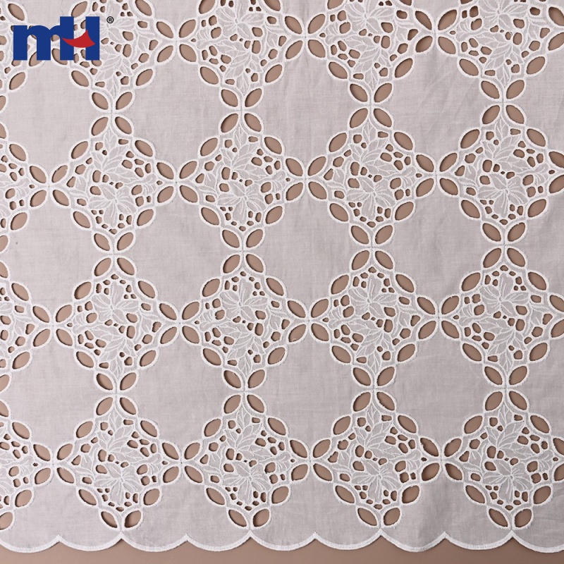 This is cotton embroidered eyelet fabric features a delicate floral cutwork pattern crafted with fine 40S/2 cotton embroidery threads on high-density cotton base fabric (60S×60S / 110×110). With a smooth hand feel and breathable texture, this lace fabric showcases refined scalloped edges and symmetrical embroidery motifs, offering an elegant and natural look.