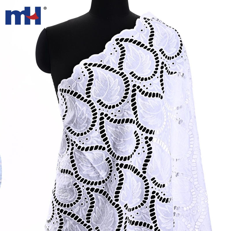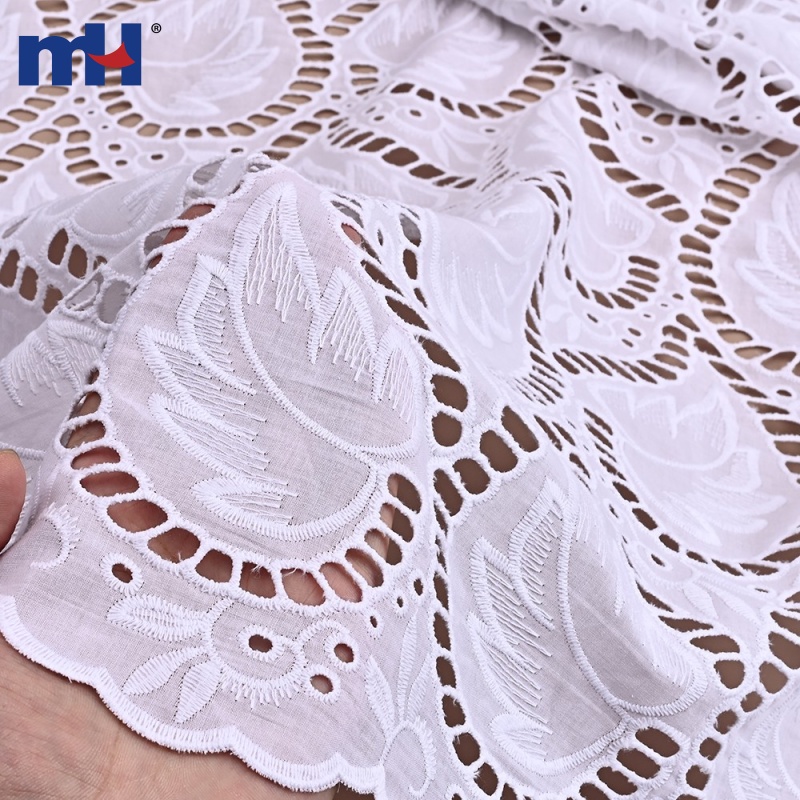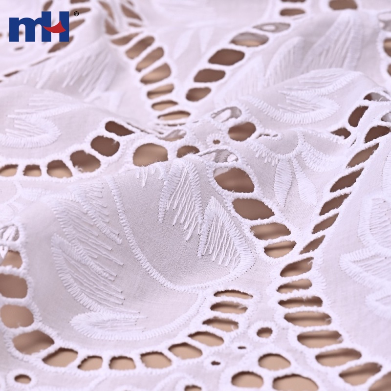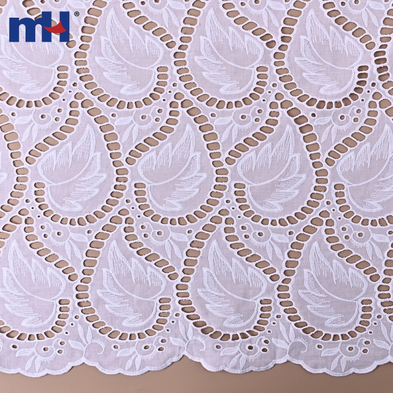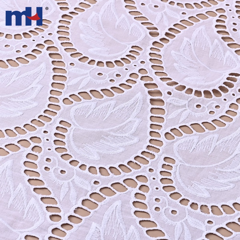 Width: 130 cm Base Fabric: 60S×60S / 110×110 cotton fabric Embroidery Thread: 40S/2 cotton thread Material: 100% cotton Color: White (customizable) MOQ: 500yds per design