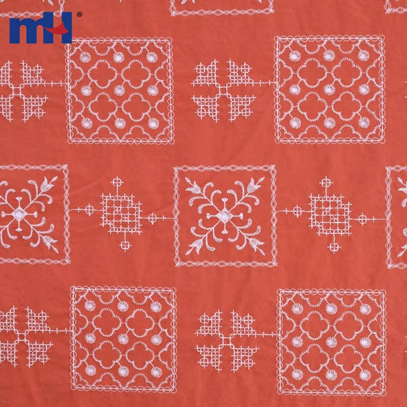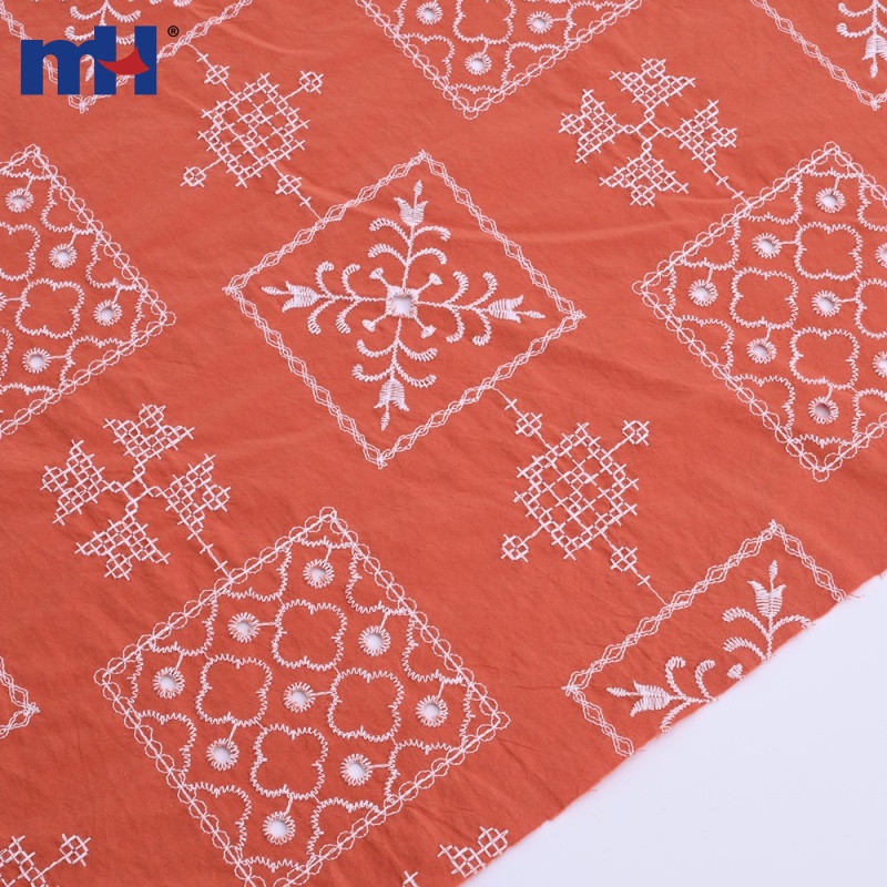 This soft and breathable 100% cotton embroidered fabric features a geometric floral square pattern stitched with fine white embroidery thread on a warm terracotta base. The embroidery creates a clean, handcrafted aesthetic that adds both texture and elegance.