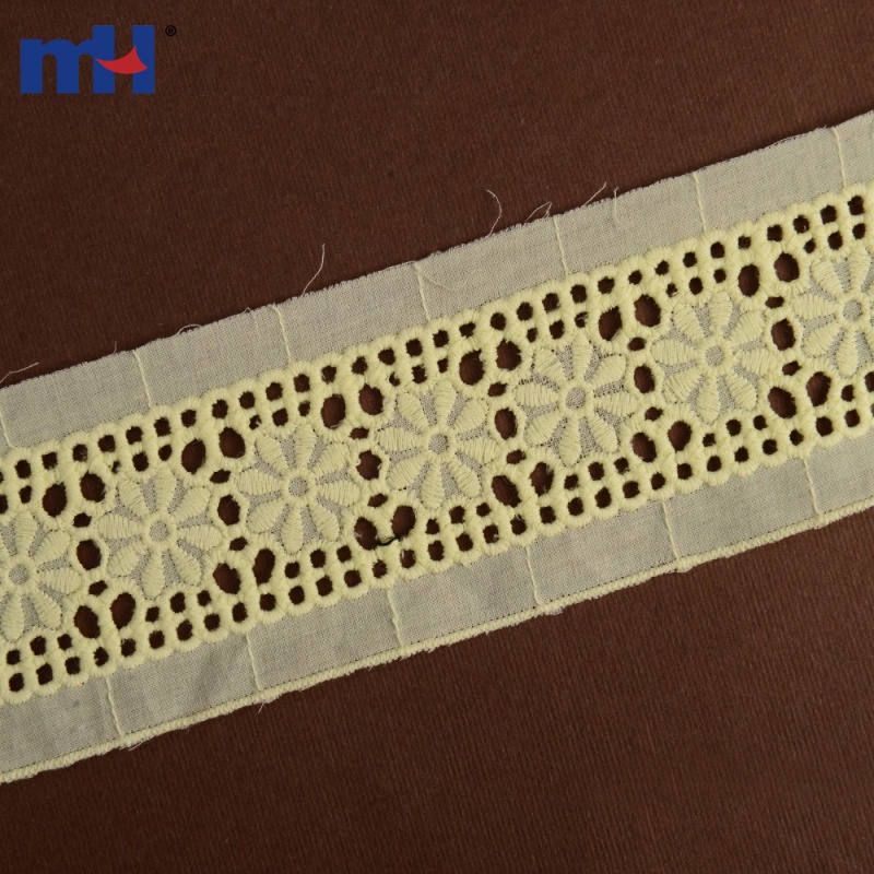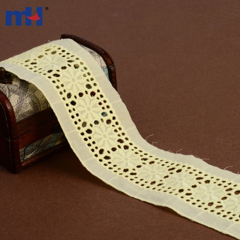 embroidery Cotton lace Trimming Size: 6.6cm Cotton lace in 100% cotton All kinds of size available upon enquiry. Available in various designs and colors as per buyers requirement.