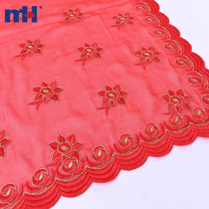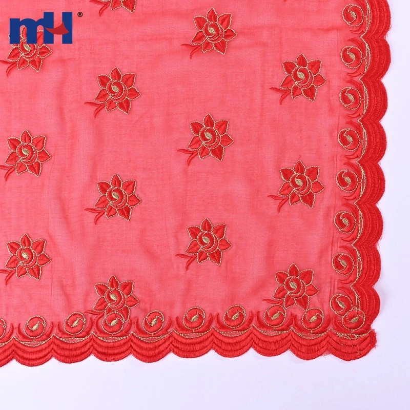 Design: This scarf is adorned with delicate floral embroidery in gold, beautifully complementing the vibrant red base. The scalloped edges feature intricate embroidered detailing, adding a luxurious and festive finish.