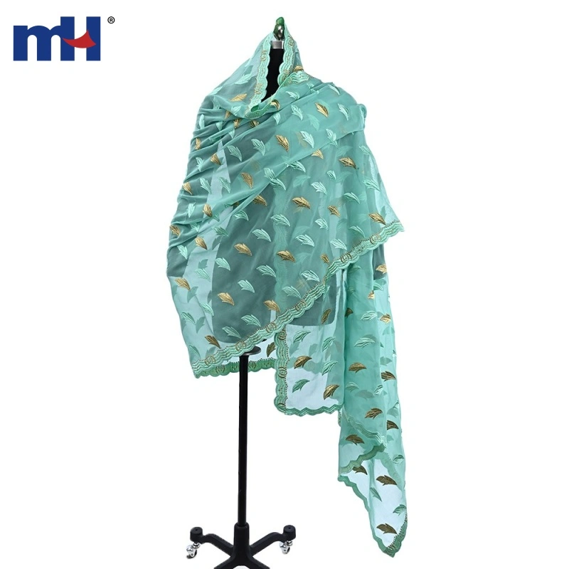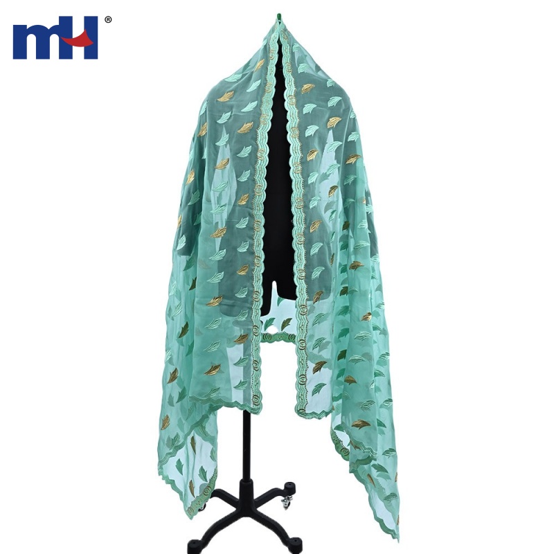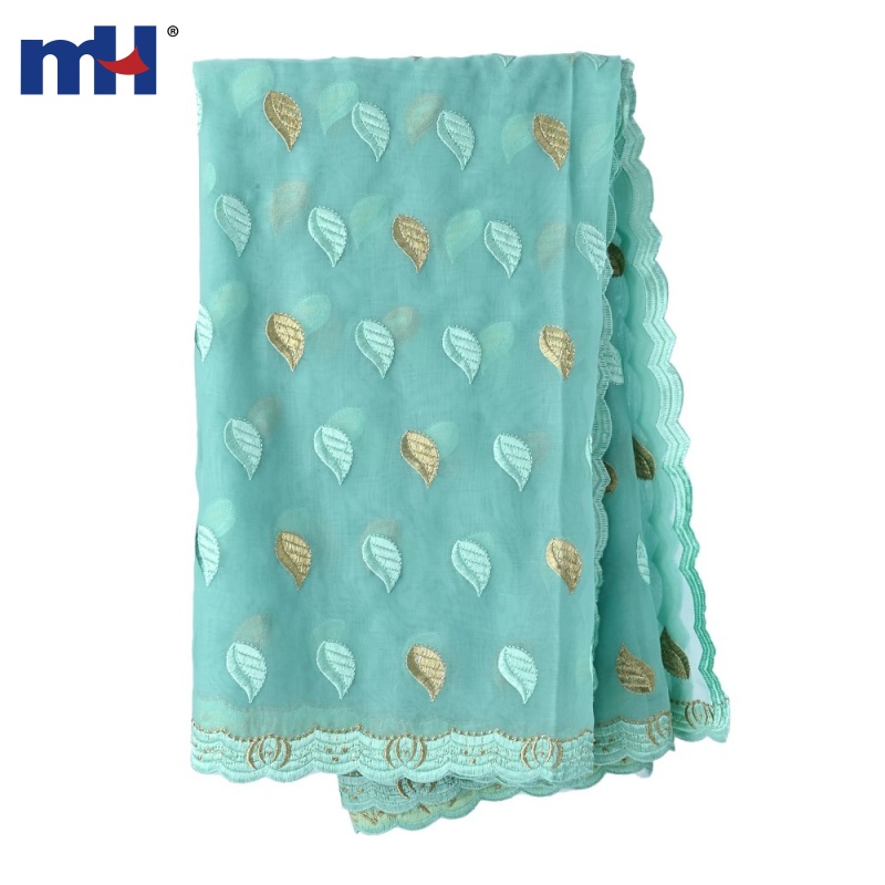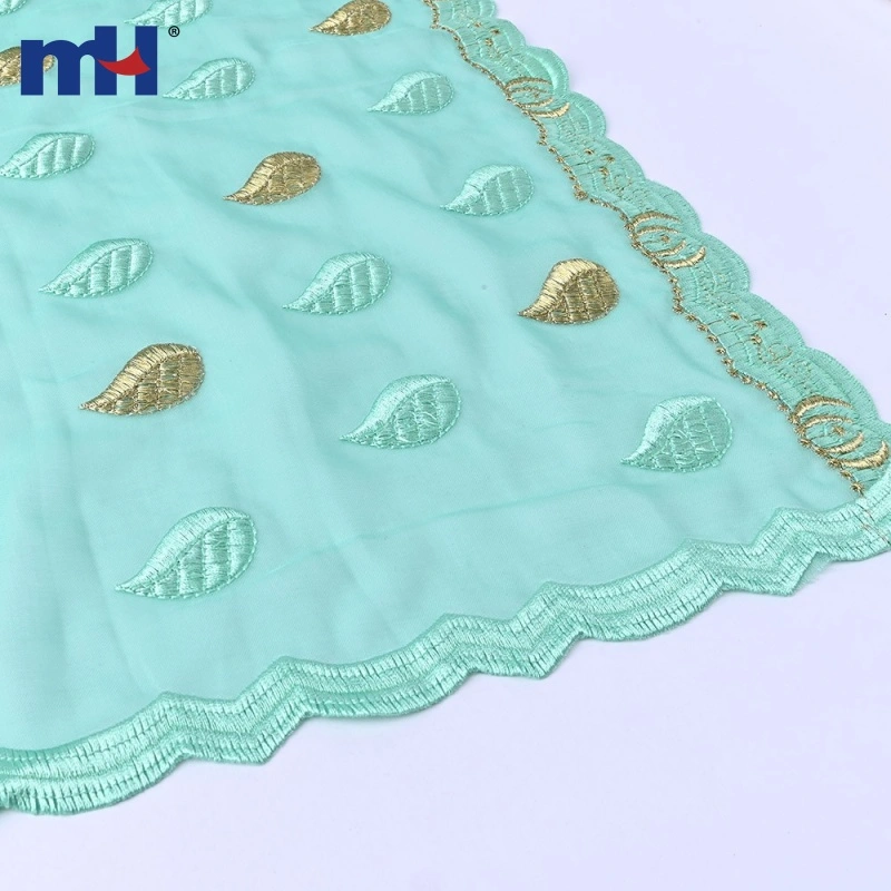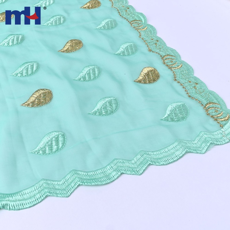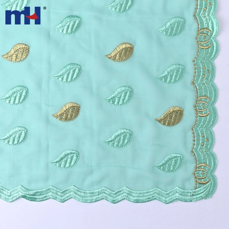 Design: Intricate embroidery featuring a charming leaf motif in alternating metallic and pastel tones, adding a sophisticated touch to the fabric. The edges are scalloped and adorned with elegant embroidered details for a polished finish.