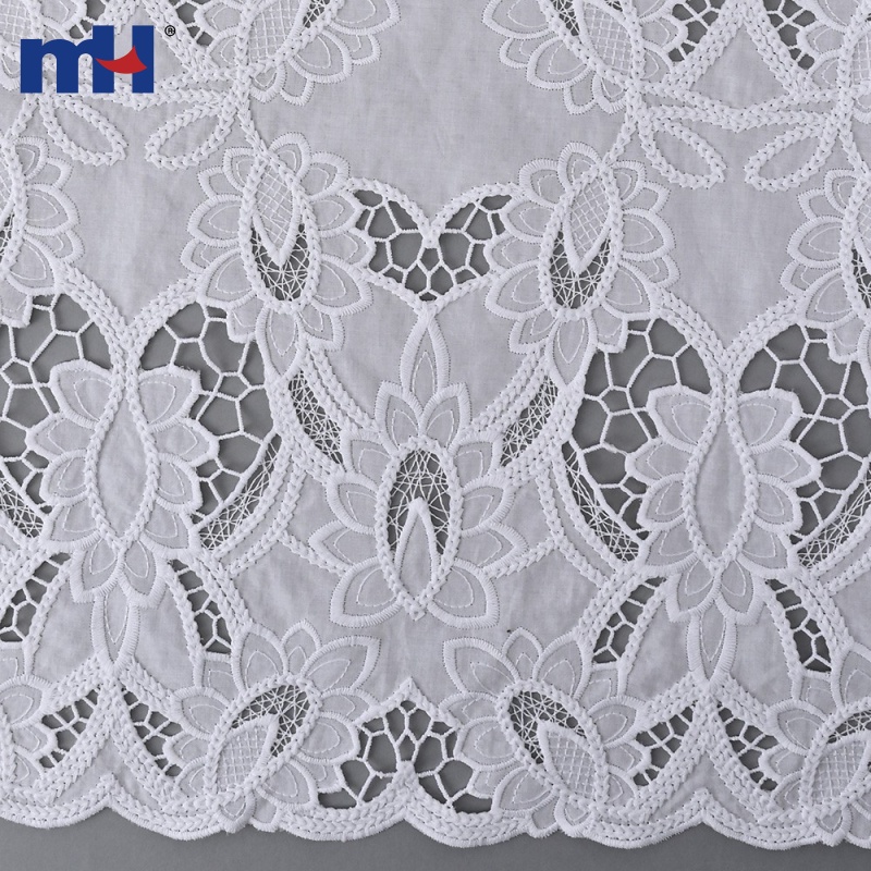 MH Laser Cut Embroidered Lace Fabric collection combines precision laser cutting with exquisite embroidery, creating elegant floral and geometric patterns with a refined three-dimensional effect. The edges are neatly finished with scalloped or customized borders, ensuring durability and a high-end look.