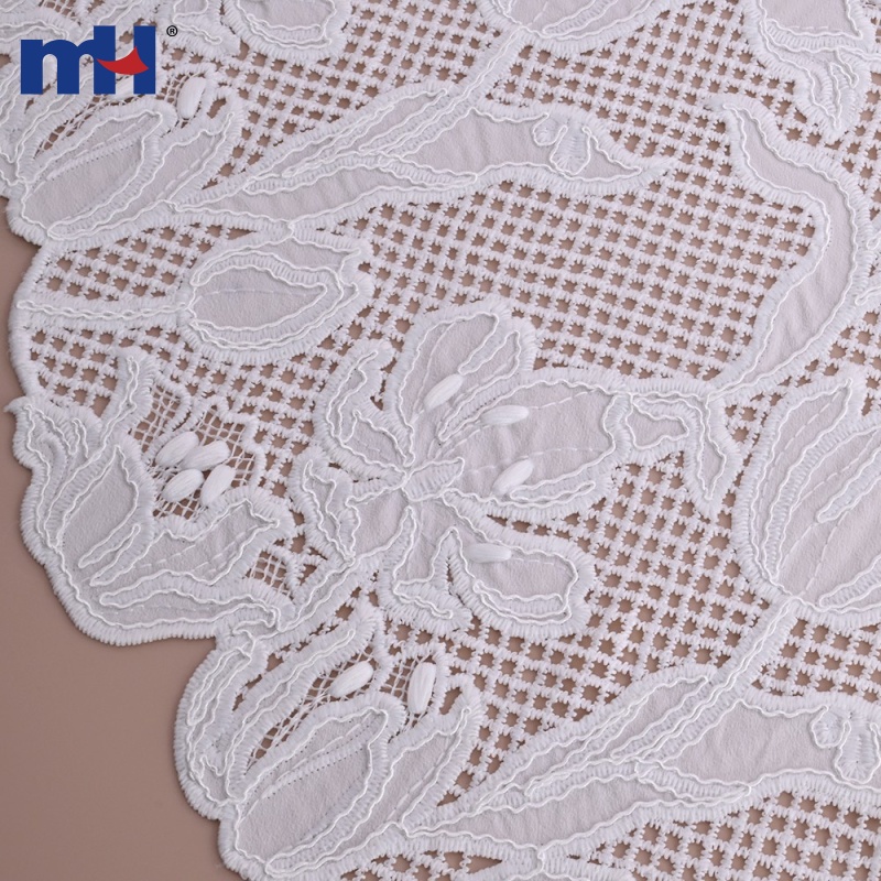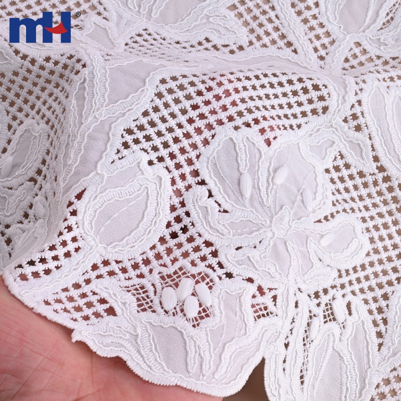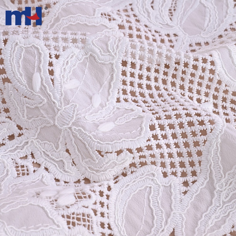 Crafted on a delicate geometric mesh background, the fabric blends precision laser cutting with rich embroidery details. The result is a fabric that is both lightweight and luxurious, ideal for bridal gowns, elegant dresses, and couture fashion. The corded floral design adds structure and tactile contrast, enhancing the fabric’s premium appeal.