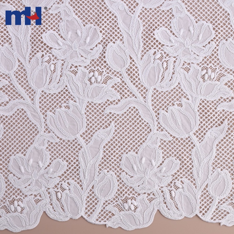This refined laser-cut embroidery lace features a floral tulip pattern outlined with corded thread, giving the flowers a raised, dimensional effect. The combination of cord embroidery and laser cutwork creates a sophisticated 3D texture that highlights the floral contours beautifully.