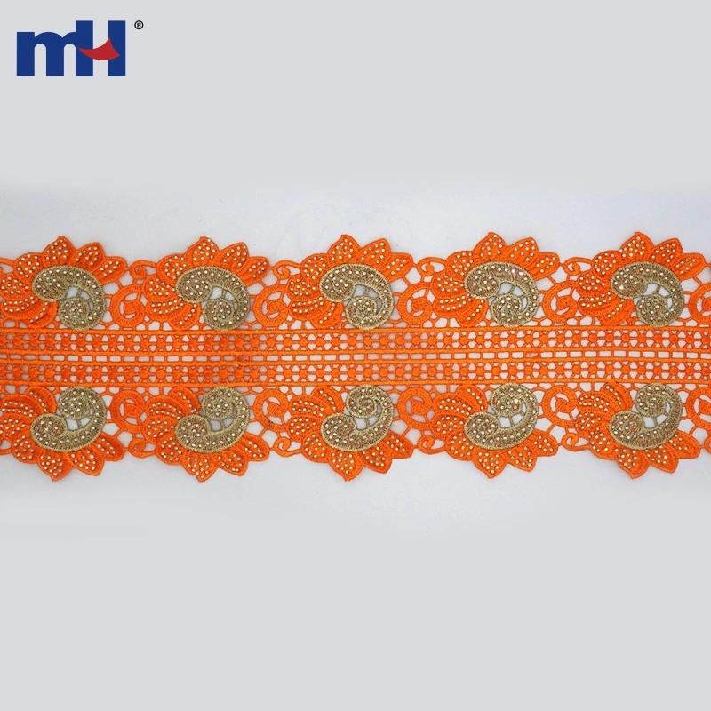 The lace is vibrant orange with metallic gold details, providing a striking visual appeal.