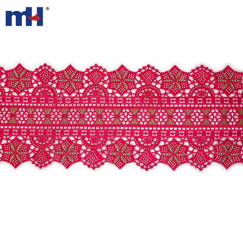 The lace is vibrant purple with metallic gold details, providing a striking visual appeal.